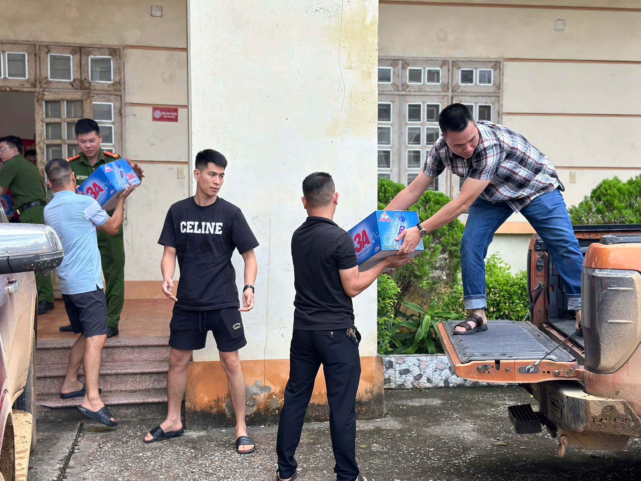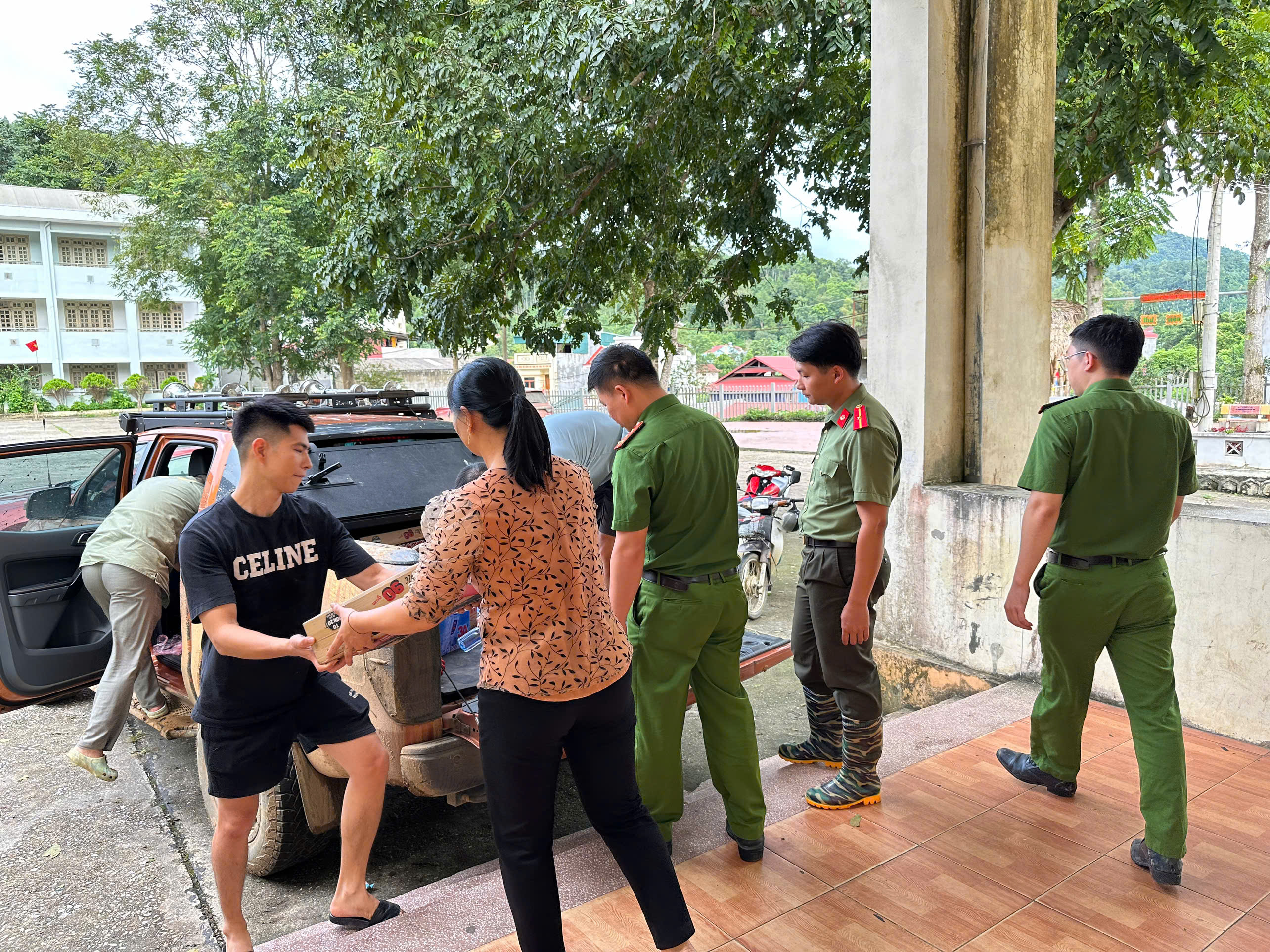 Đoàn thiện nguyện công ty Đức Tâm và một số cán bộ chiến sĩ công an chuyển hàng vào điểm tập kết.