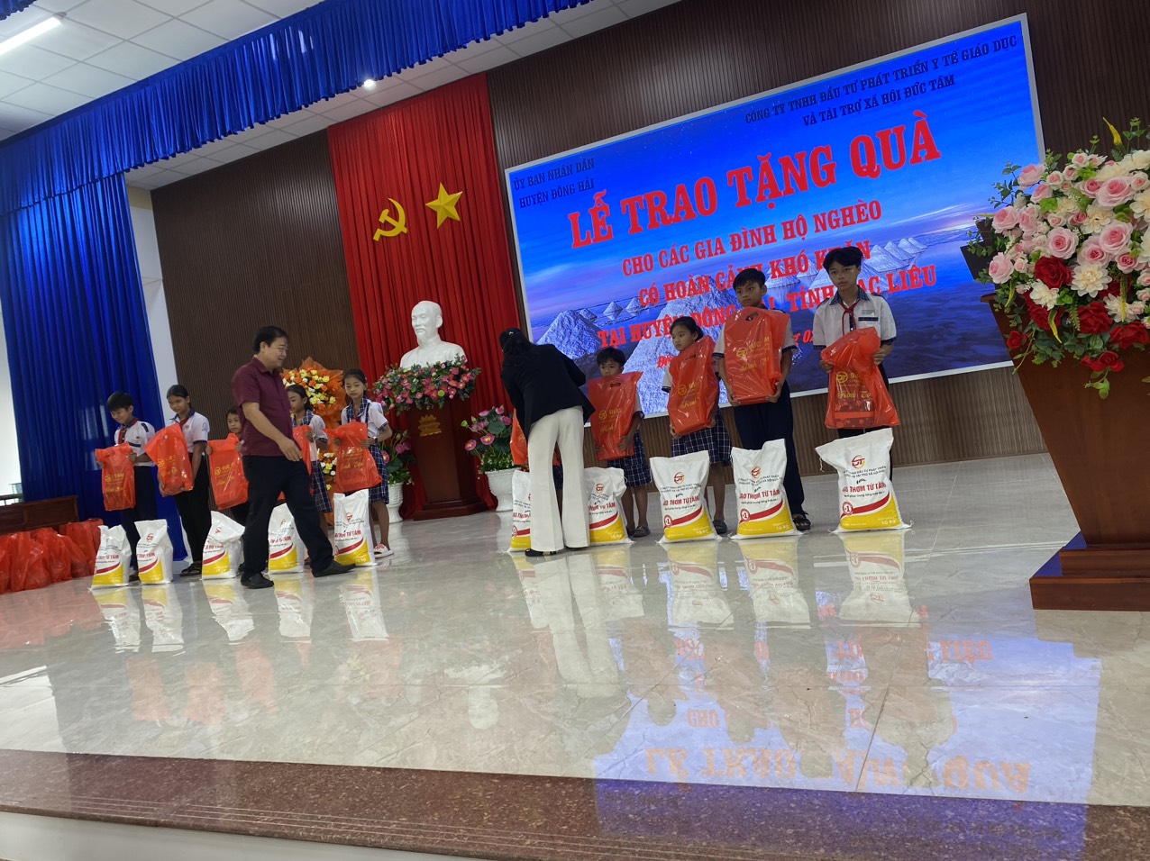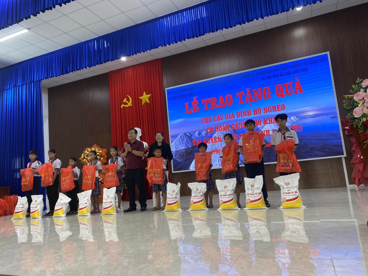 Giám đốc công ty Đức Tâm chi nhánh phía Nam cùng cán bộ đại diện UBND Huyện Đông Hải lên trao quà cho các cháu và chụp ảnh lưu niệm.