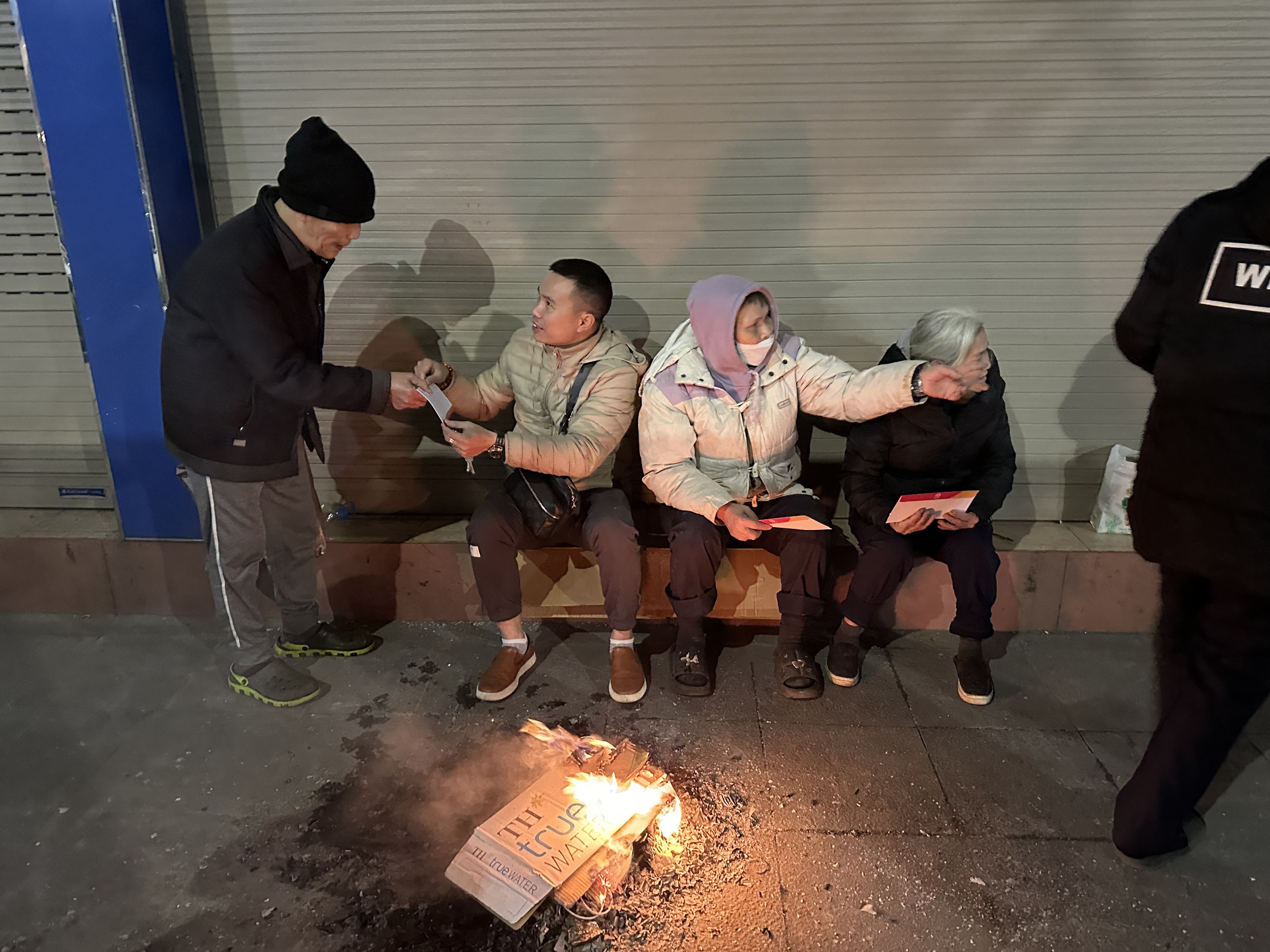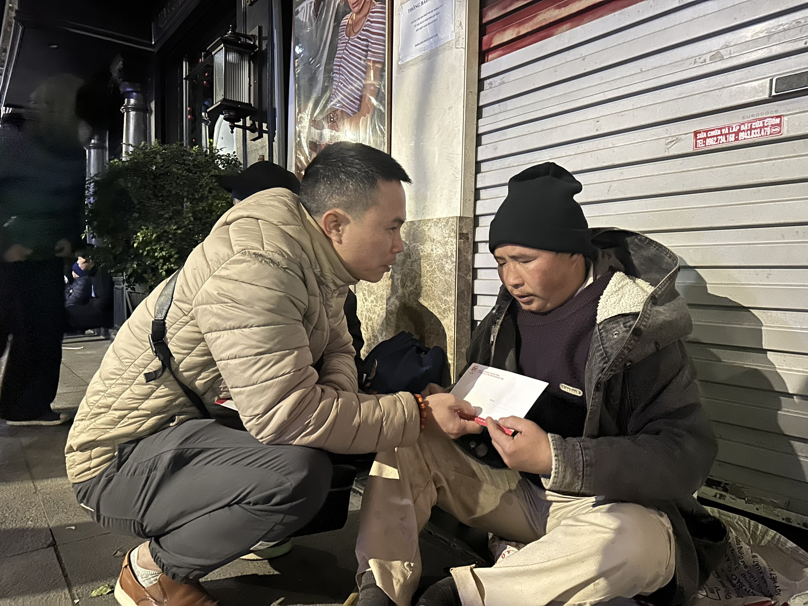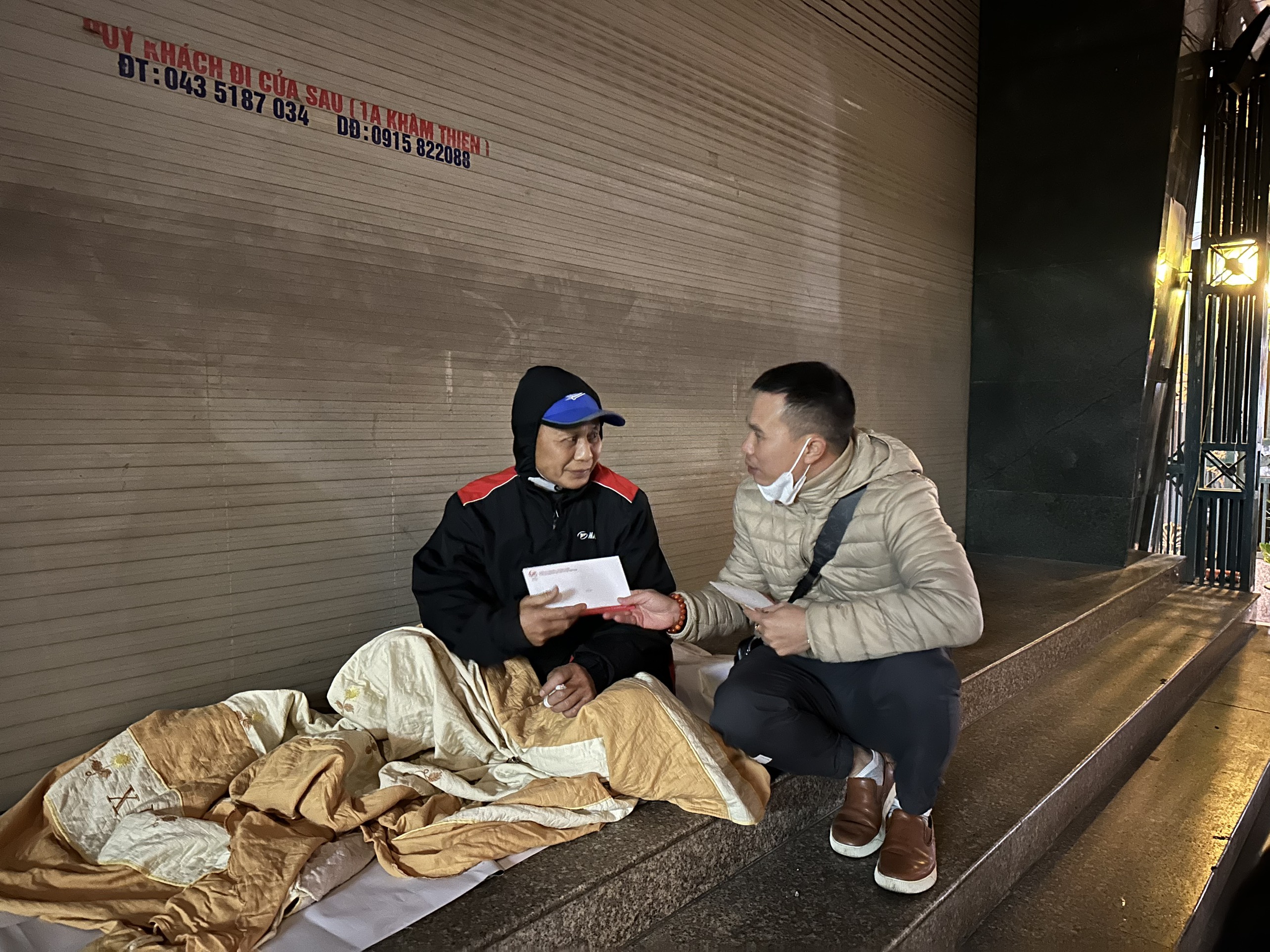 Phó giám đốc công ty Đức Tâm trao quà cho các ông, bà đang sưởi ấm bằng những tấm bìa caton ở ven đường.