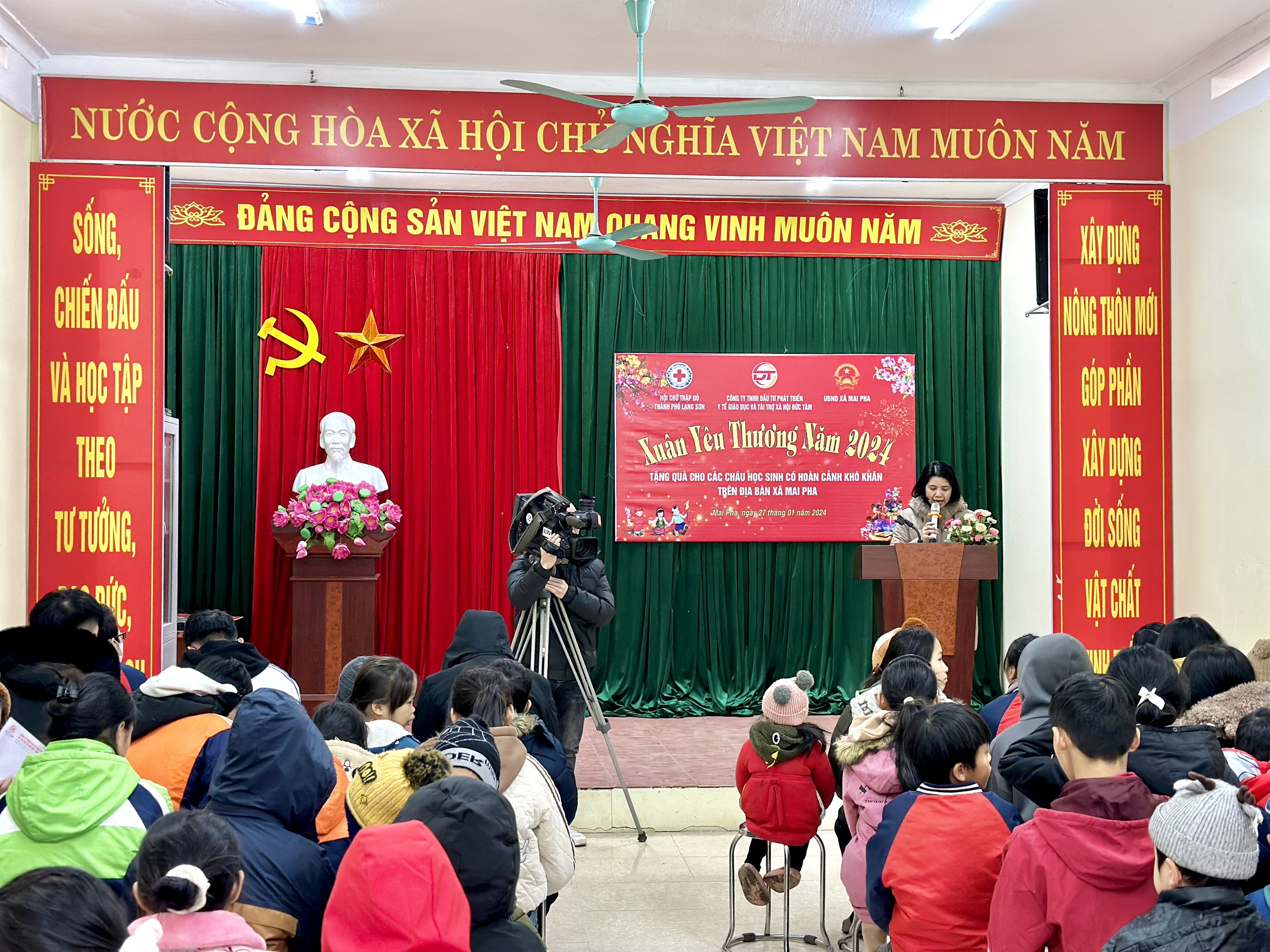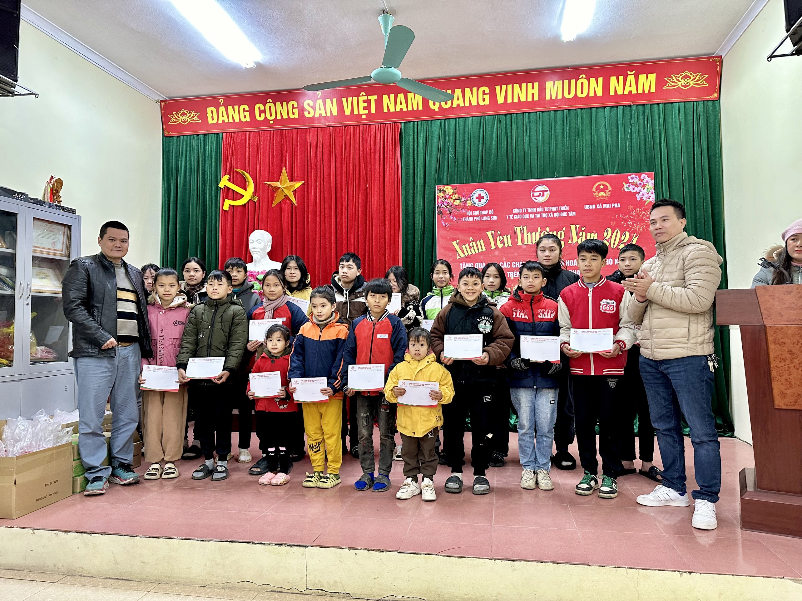 Chiều ngày 27/01/2024 công ty TNHH đầu tư phát triển y tế giáo dục và tài trợ xã hội Đức Tâm kết hợp với Hội chữ thập đỏ thành phố Lạng Sơn và UBND xã Mai Pha tặng quà cho các cháu học sinh có hoàn cảnh khó khăn trên địa bàn xã Mai Pha.